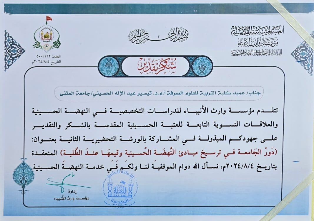 2024-08-06تتقدم عمادة ومنتسبي كلية التربية للعلوم الصرفة متمثلة بعميد الكلية الاستاذ المساعد الدكتورة تيسير عبد الاله الحسيني بأبهى كلمات التهنئة والتبريكات الى الاستاذ المساعد الدكتورة ضي علي عزيز بمناسبة تسنمها منصب رئيس قسم علوم الحياة في كليتنا سائلين المولى عز وجل دوام الموفقية والنجاح في مسيرتها العلمية والوظيفية خدمة لجامعتنا العزيزة .