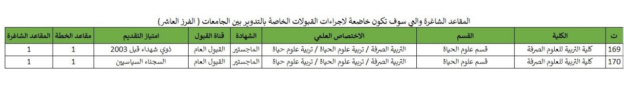 تعلن كلية التربية للعلوم الصرفة دراسة الماجستير قسم علوم الحياة عن فتح باب التدوير بين الجامعات وللناجحين حصرا وللمقاعد الشاغرة بالتدوير بين الجامعات (الفرز العاشر) ”