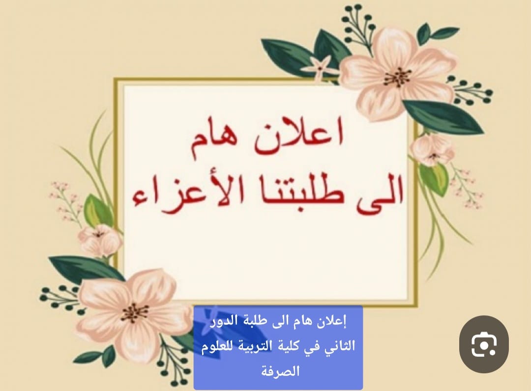 كلية التربية للعلوم الصرفة تنفذ حملة لصيانة القاعات الدراسية2025-08-26جدول الامتحانات النهائية الدور الثاني2025-08-26 جدول الامتحانات النهائية للدور الثاني اعلان هام جدول الامتحانات النهائية الدور الثاني لطلبة الدراسات الأولية في كلية التربية للعلوم الصرفة بجامعة المثنى Share3 رعد حمودي Related posts2025-09-30إعلان هام إلى الطلبة الراغبين في التقديم للدراسة المسائية في اقسام كلية التربية للعلوم الصرفةRead more