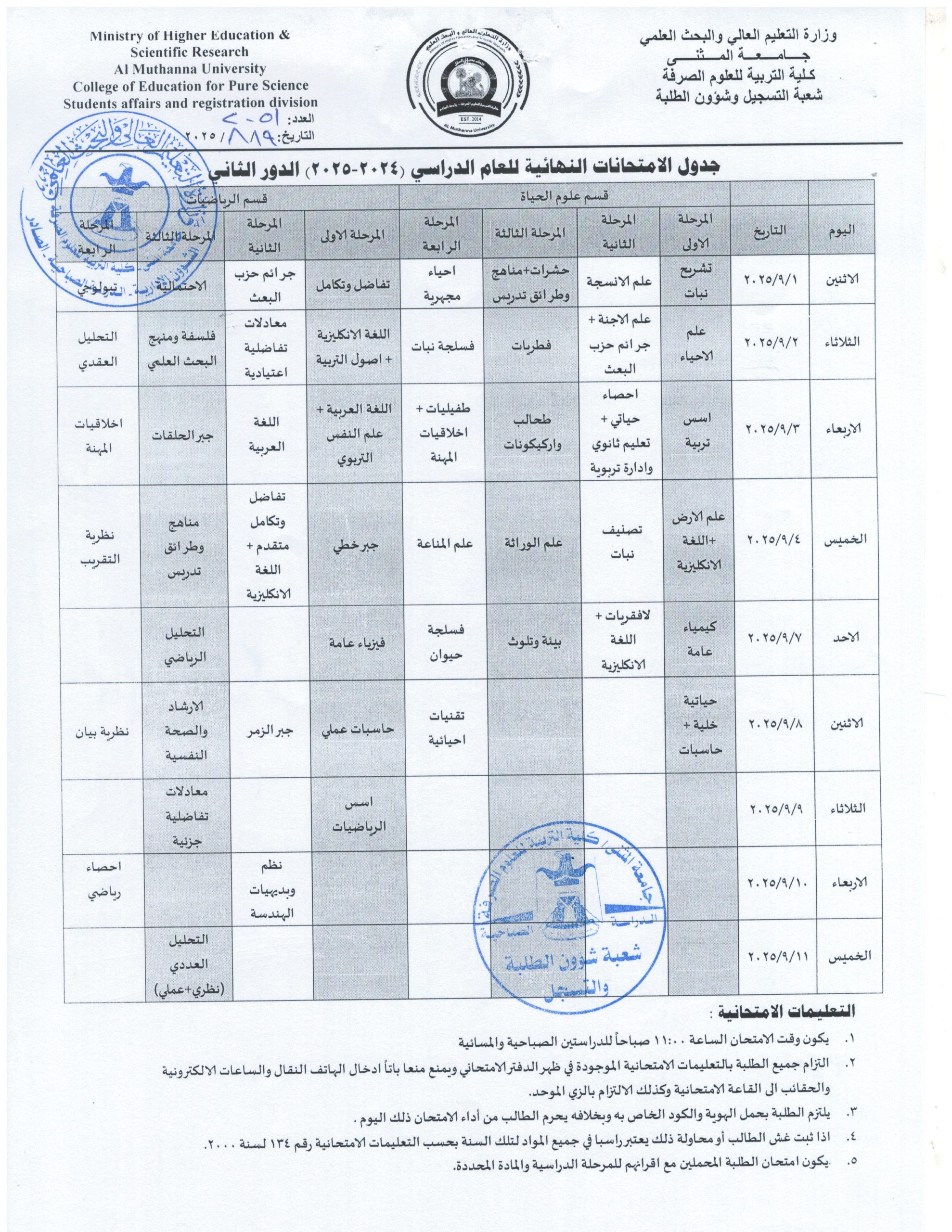 جدول الامتحانات النهائية الدور الثاني لطلبة الدراسات الأولية في كلية التربية للعلوم الصرفة بجامعة المثنى