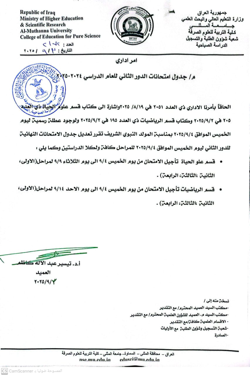 اعلان تعديل جدول الامتحانات الدور الثاني ليوم الخميس لوجود عطلة رسمية بمناسبة المولد النبوي الشريف في قسم علوم الحياة وقسم الرياضيات في كلية التربية للعلوم الصرفة بجامعة المثنى