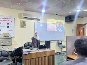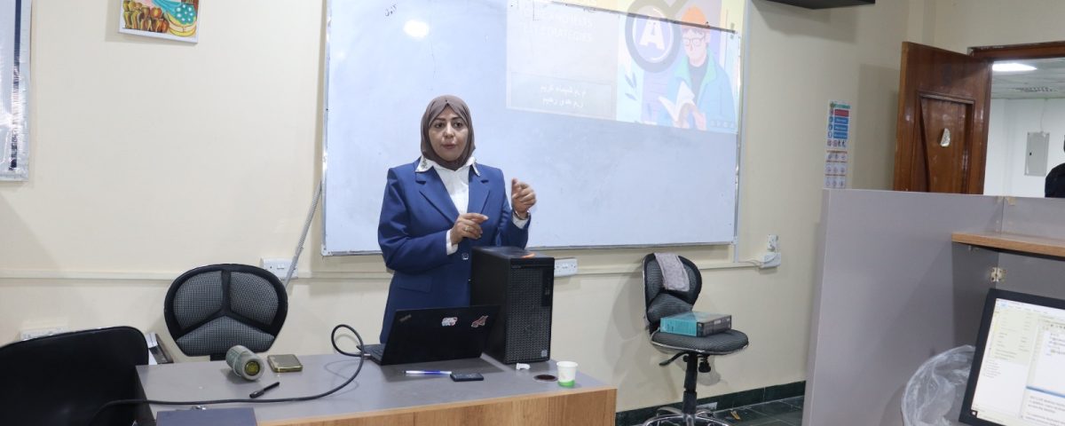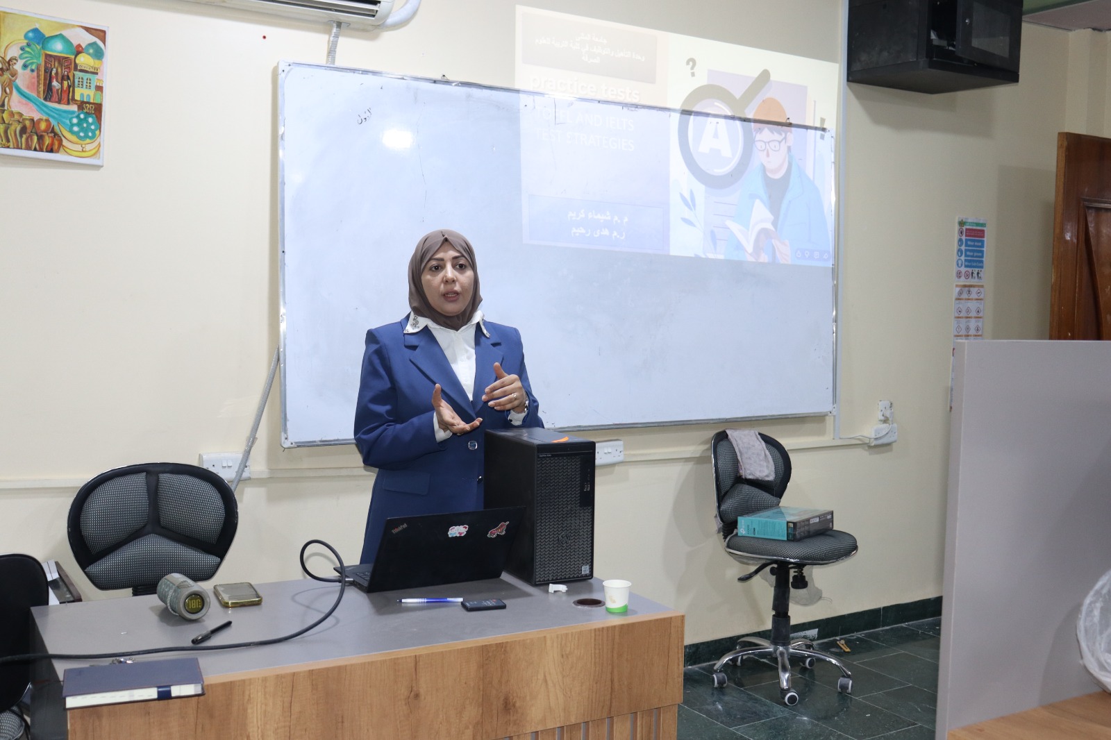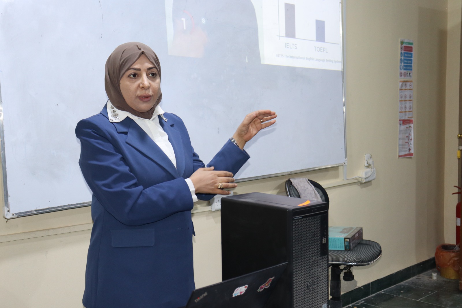 بأشراف عميد كلية التربية للعلوم الصرفة بجامعة المثنى الأستاذ الدكتورة تيسير عبد الإله الحسيني أقامت وحدة التأهيل والتوظيف ورشة عمل بعنوان استراتيجيات اختبارات اللغة الإنكليزية التوفل التي القتها م.م شيماء كريم ر.م هدى رحيم