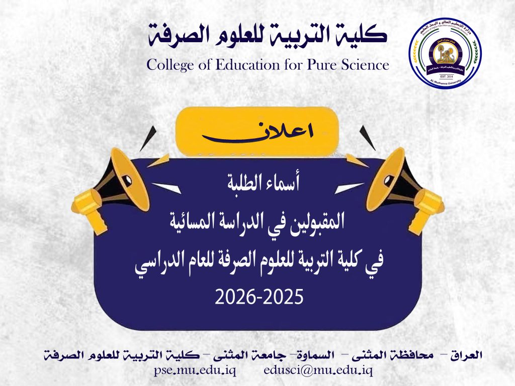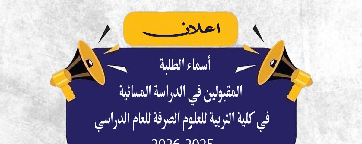 2025-11-10الى جميع الطلبة المقبولين في كلية التربية للعلوم الصرفة للدراسة المسائية للعام الدراسي 2025–2026،