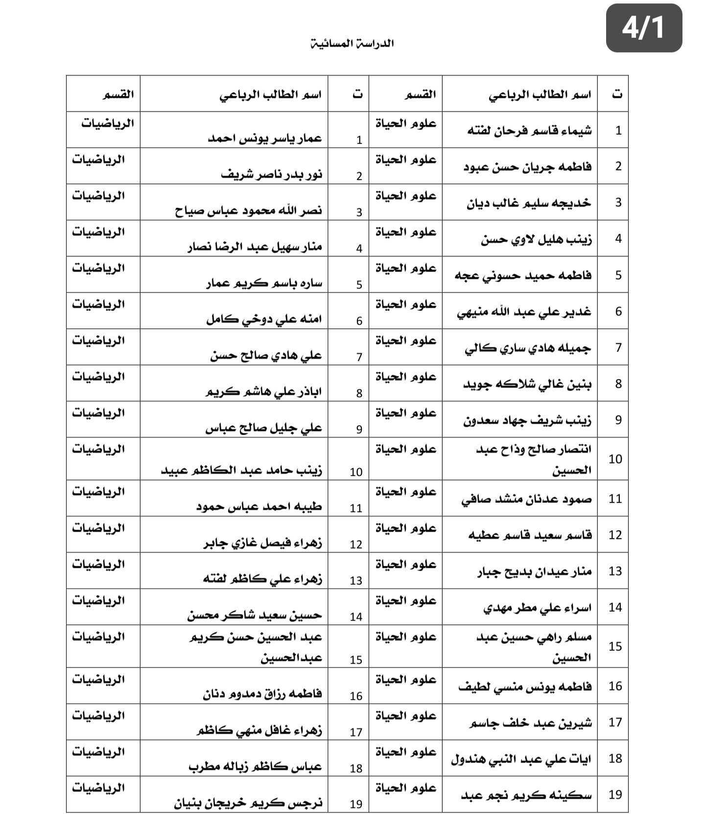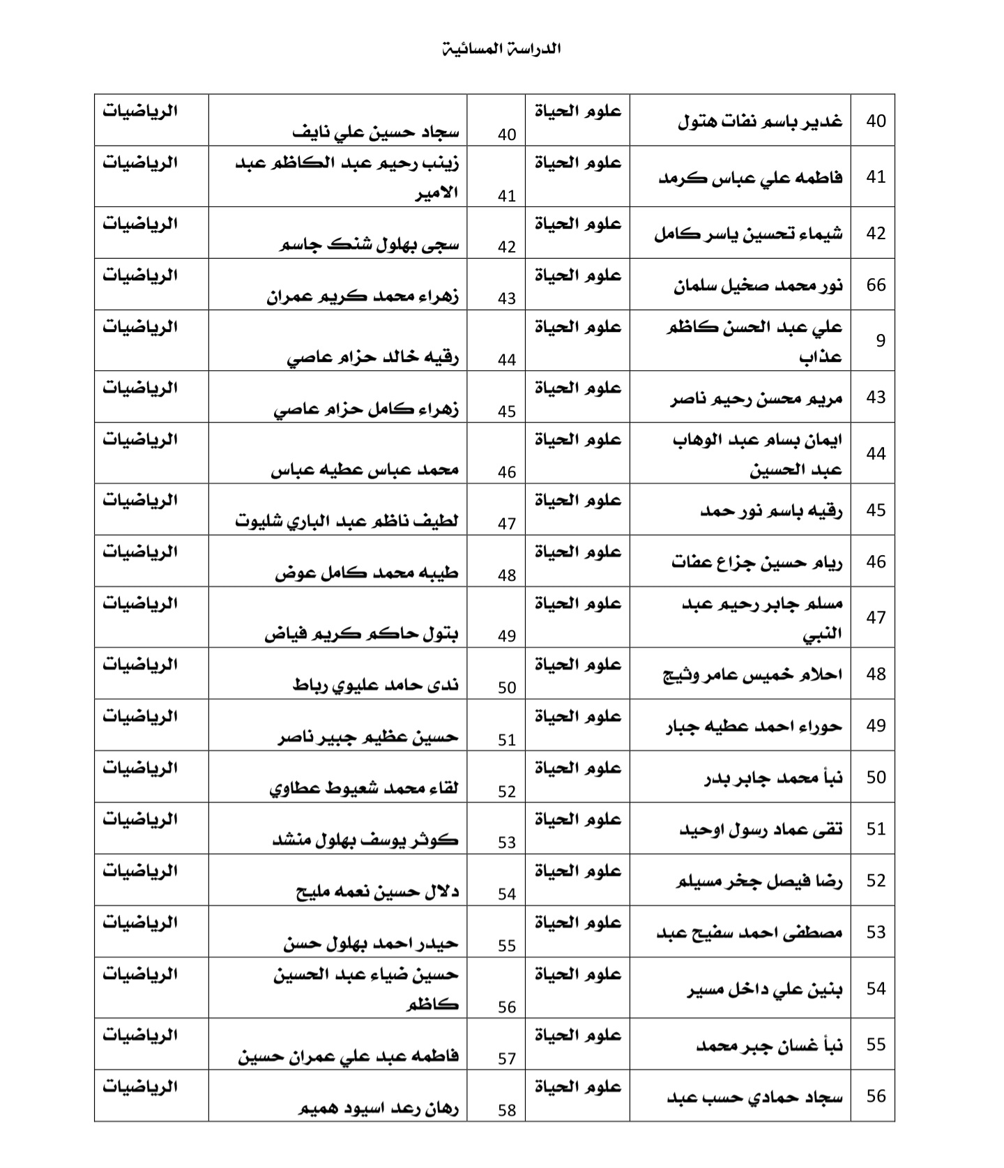 اعلان الى طلبة قسم علوم الحياة المرحلة الاولى للدراسة المسائية الوجبة الاولى
