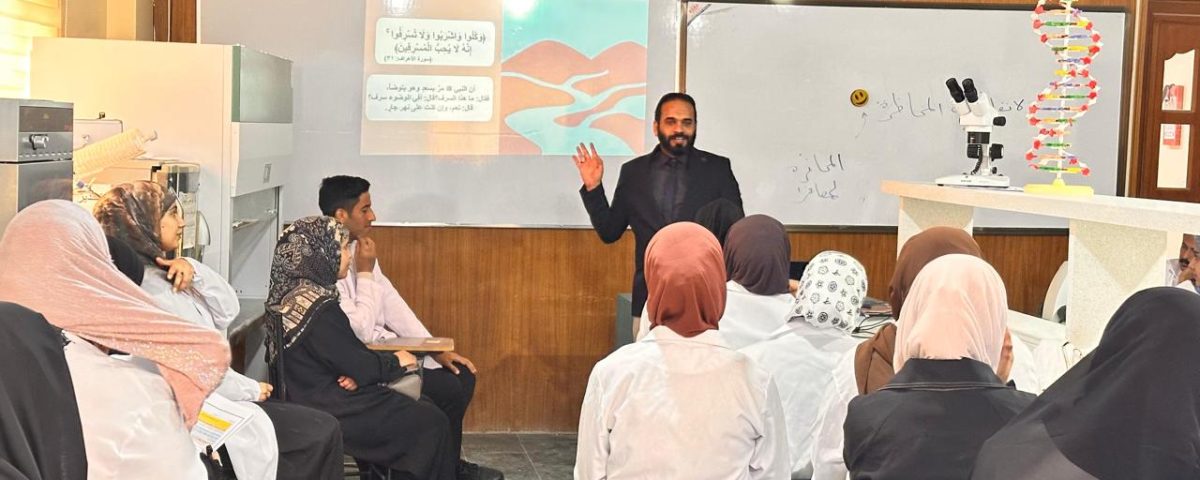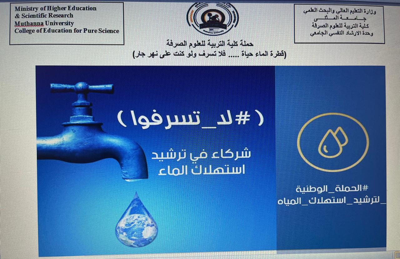بإشراف السيدة عميد كلية التربية للعلوم الصرفة بجامعة المثنى الأستاذ الدكتورة تيسير عبد الإله الحسيني، أقامت وحدة الإرشاد النفسي الجامعي حملة توعوية بعنوان قطرة الماء حياة فلا تسرف ولو كنت على نهر جار القاها م.م ضرغام خالد ناصر
