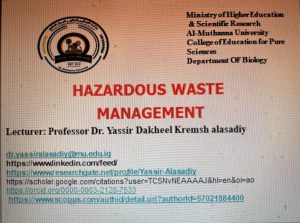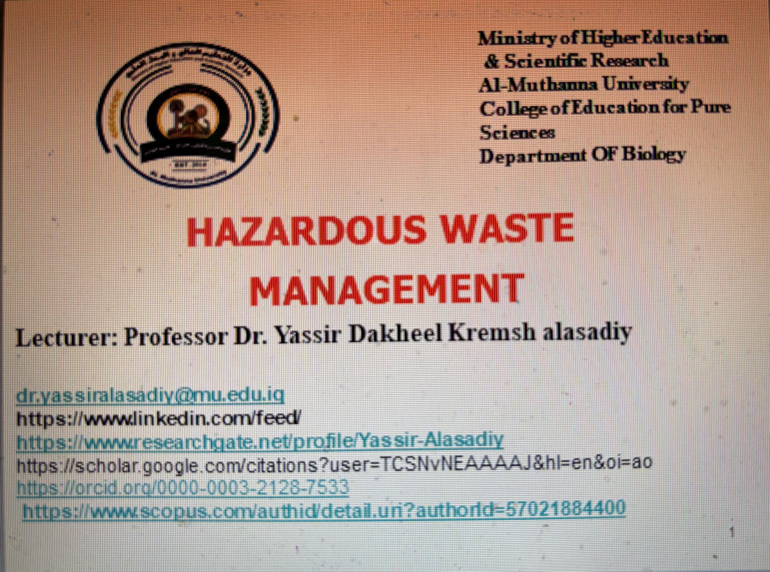 بأشراف عميد كلية التربية للعلوم الصرفة بجامعة المثنى الأستاذ الدكتورة تيسير عبد الإله الحسيني ، نظمت الكلية ورشة عمل بعنوان( HAZARDOUS WASTE MANGEMENT) التي ألقاها الأستاذ الدكتور ياسر دخيل التدريسي في كليتنا من برنامج تطوير مهارات البحث العلمي ونفذت الورشة عمل الكترونيا، وقد حضر الورشة طلبة الدراسات العليا (الماجستير الدكتوراه ) من كليات المختلفة التابعة لجامعة المثنى .