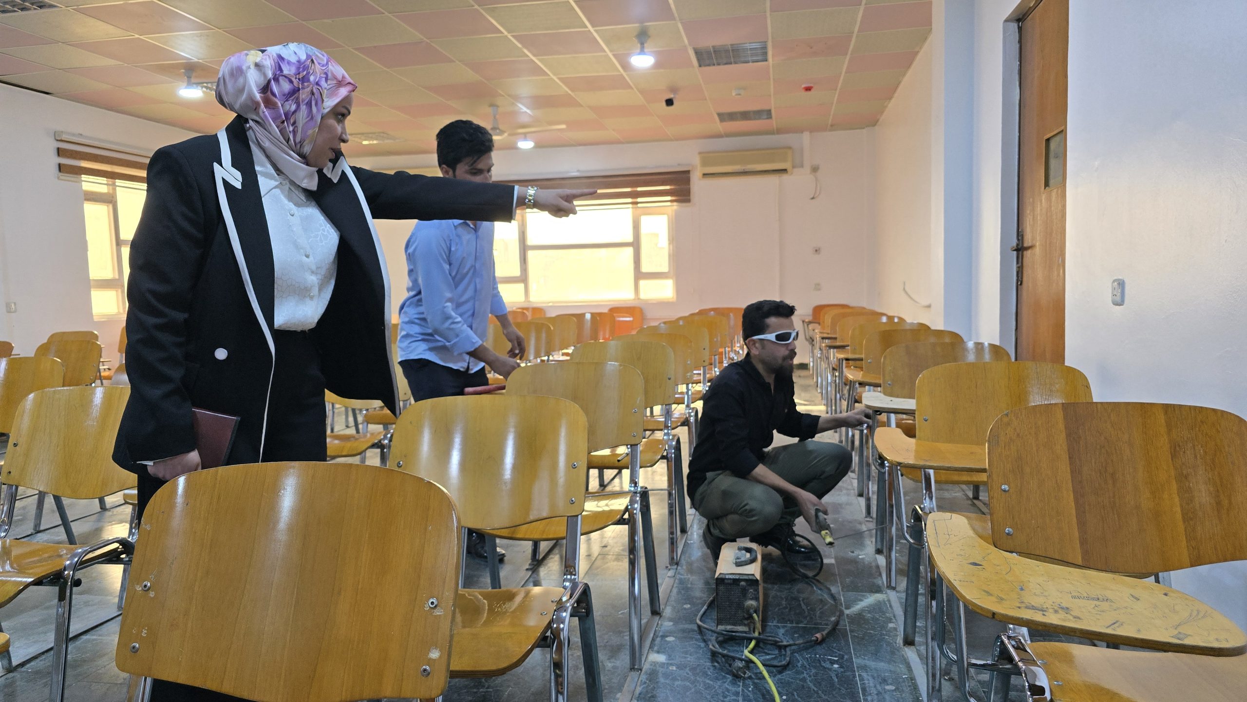 وشهدت الحملة مشاركة فاعلة لطلبة القسم والمتمثلة برئيس القسم الدكتورة ضي علي عزيز حيث تضمنت الأعمال لحام المقاطع الحديدية واستبدال المقاعد الخشبية المتضررة واعادة صيانتها بما يضمن سلامتها وجاهزيتها للاستخدام