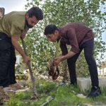 وحدة التشجير مع طلبة قسم علوم الحياة يزرعون الأشجار حول سور الكلية